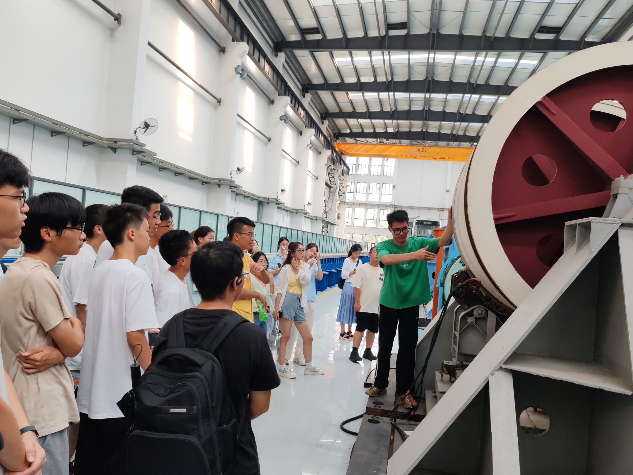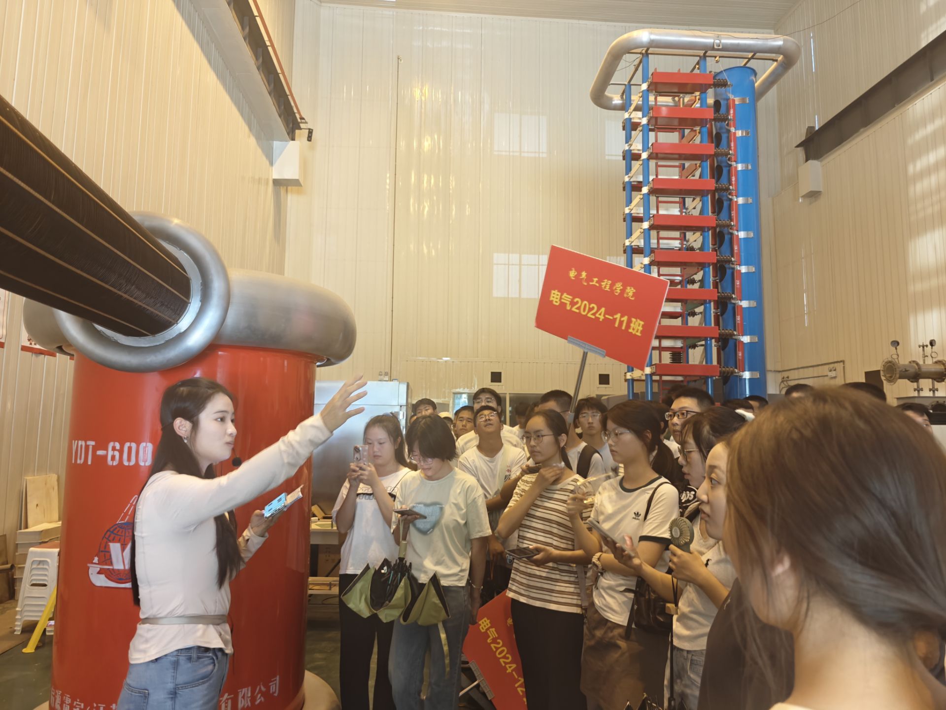 合影结束后,各班级分组进行实验室参观。同学们按计划前往交大磁浮实验中心、四川省轨道交通高电压技术工程研究中心、国家轨道交通电气化与自动化工程技术研究中心接触网大厅和伟德官方网站装备智能制造产教融合示范中心。研究生学长学姐详细讲解了受电弓、接触网以及高压实验相关设备,激发了同学们对大学课程与前沿科技的浓厚兴趣。