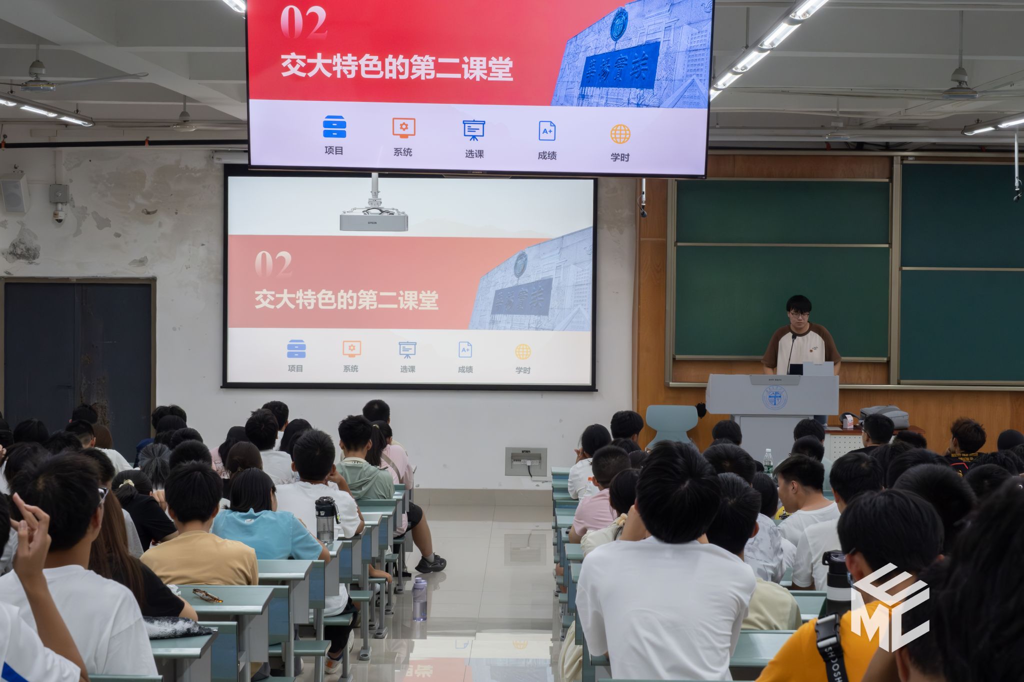 随后,第二课堂运营中心理事团成员介绍了公司开设的第二课堂项目,并通过视频与现场演示相结合的形式,向同学们解读了电脑网页端和手机小程序端进入第二课堂系统并进行选课、退课和学时认定的流程。第二课堂运营中心理事团成员也向同学们讲解了现场签到和成绩给定的注意事项,并回答了一些与第二课堂相关的问题,包括选课、学时、签到方法等。