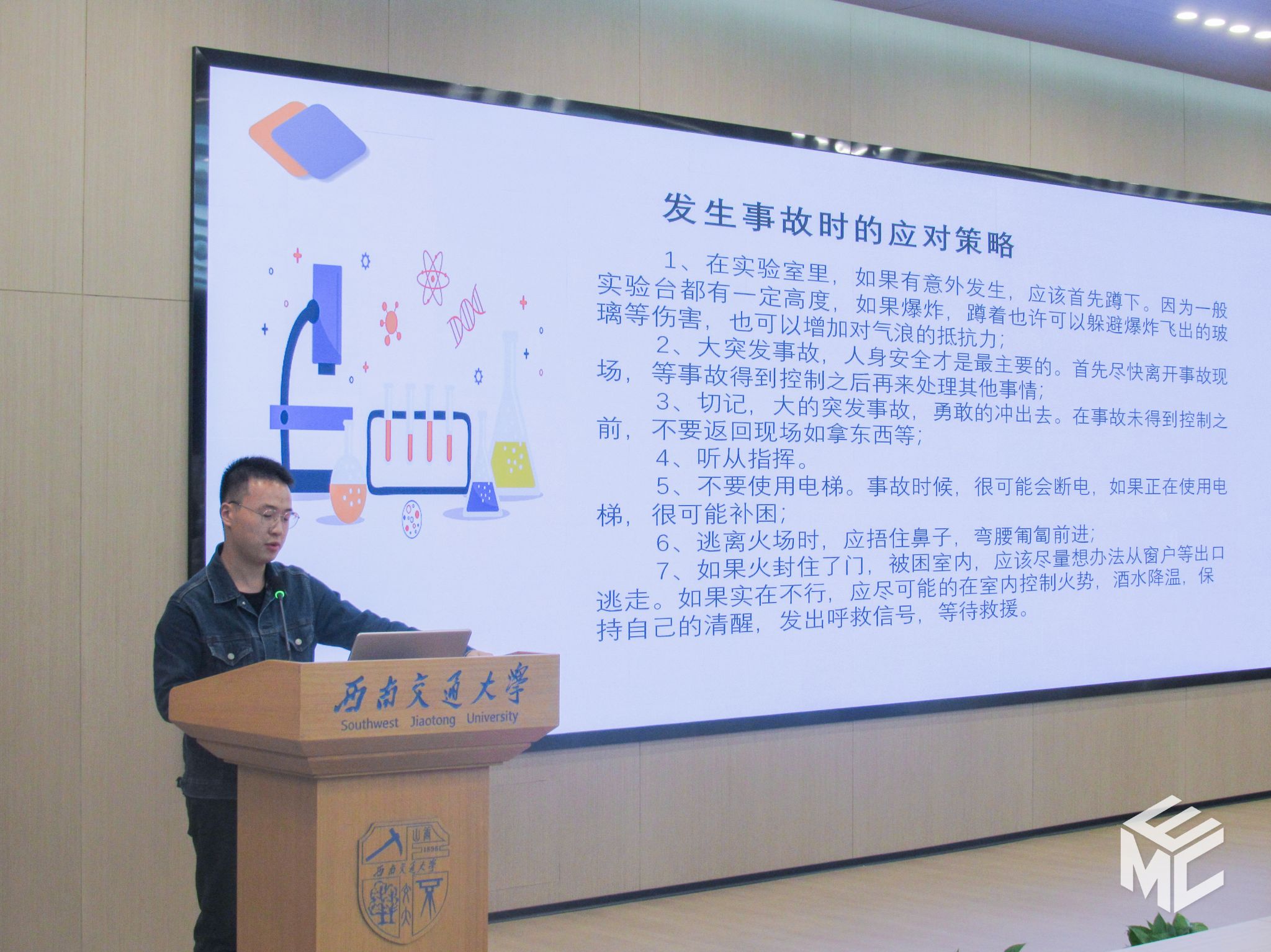 随后,杨之溢老师和艾效天老师从实验室事故警示、实验室安全隐患及因素、实验室安全细则、应对策略及事故应急处理四个方面为同学们讲解实验室安全。通过本次实验室安全教育活动,同学们树立了“安全第一”的理念,筑牢实验室安全防线,进一步提升自己的安全意识和安全素养,为营造安全、和谐的教学和科研环境贡献自己的力量。