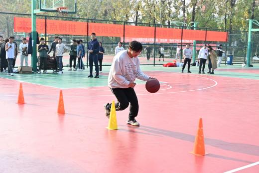 接着,辅导员邹伟豪老师对挑战赛的具体规则进行讲解,每位参与挑战的同学必须通过四个关卡:第一关为运球绕障碍桶S型前进,在此过程中不能将球运掉或碰倒障碍桶;第二关为在障碍桶面前完成变向后上篮;第三关为在固定的点位将球投出,需要让球穿过放在固定位置的轮胎;最后一关是站在罚球线处进行投篮。