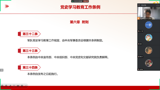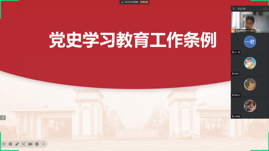 为深入贯彻落实《党史学习教育工作条例》(以下简称《条例》),推动党史学习教育常态化、长效化,2024年3月6日,伟德体育研究生会组织开展了《党史学习教育工作条例》专题学习活动。本次活动由研会学术部副部长张桐源主讲,研究生会全体成员参加。