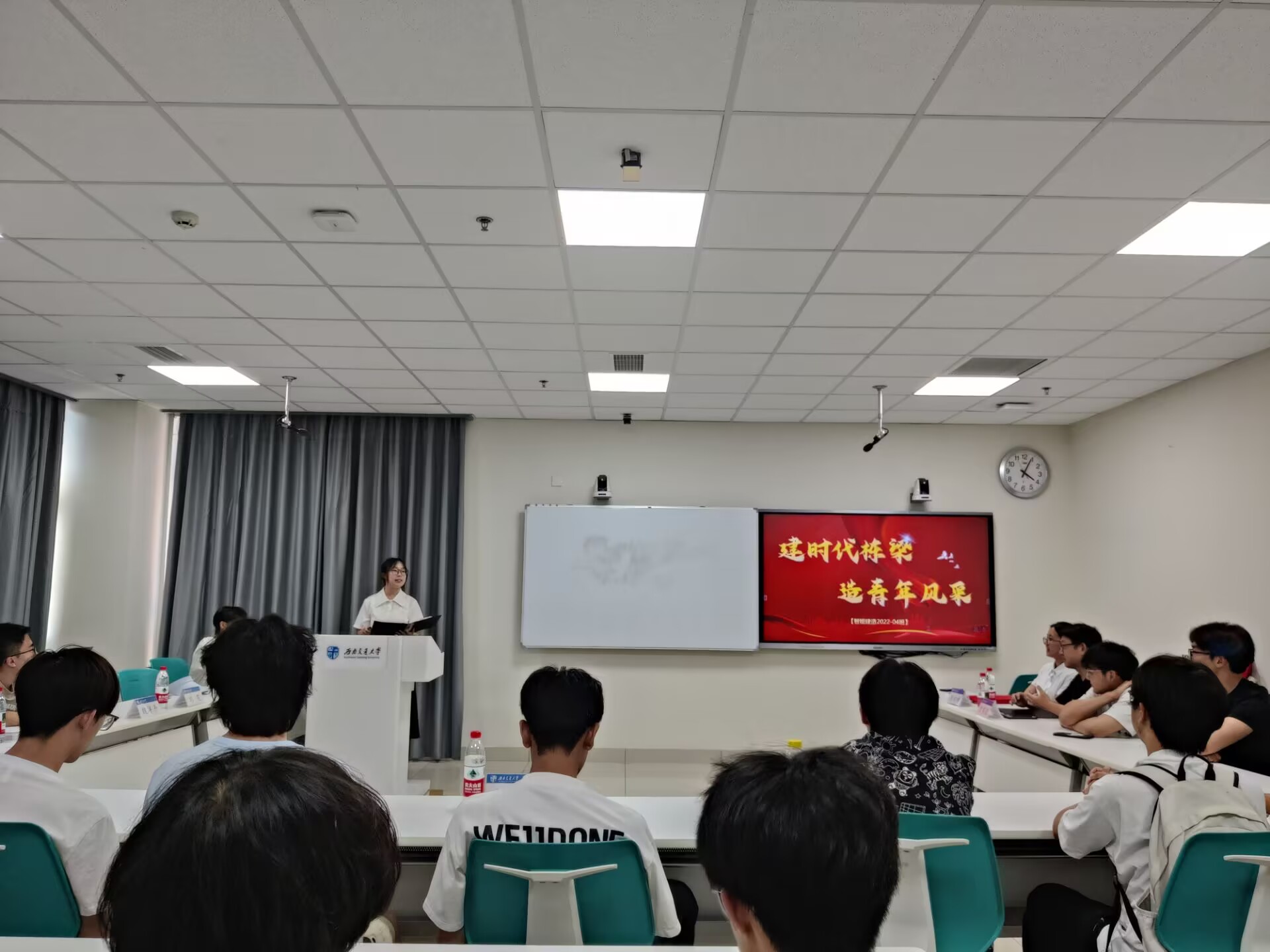 智慧城市与交通公司刘雯同学着重介绍班级思想引领,实行班团一体化,三会两制一课等制度,班级开展团课40余次,中共党员占比30%,班级“喜迎二十大,永远跟党走”主题团日活动被公司官方公众号和官网采用。