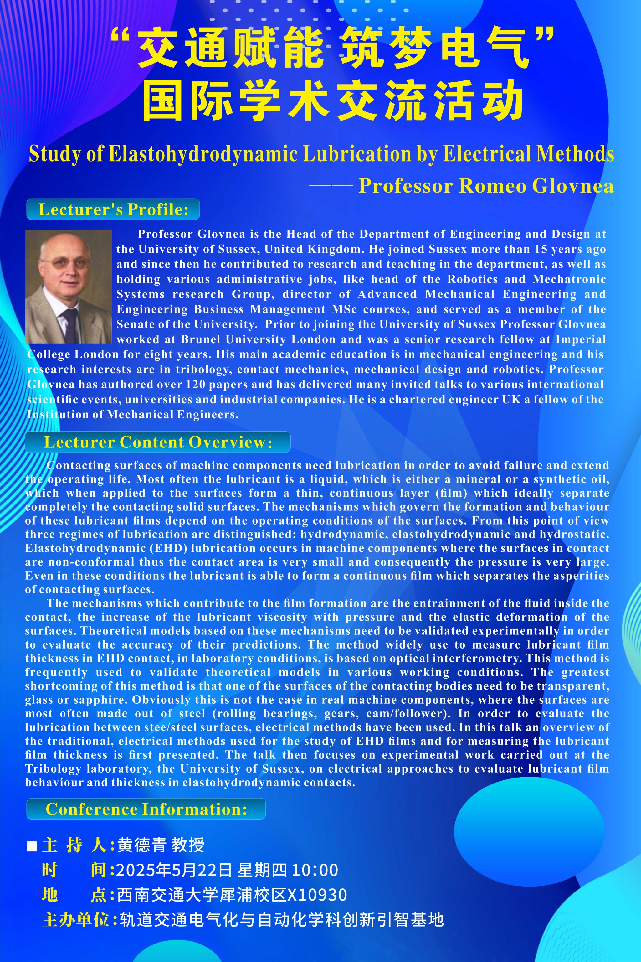 “交通赋能 筑梦电气”国际学术交流活动:Study of Elastohydrodynamic Lubrication by Electrical Methods