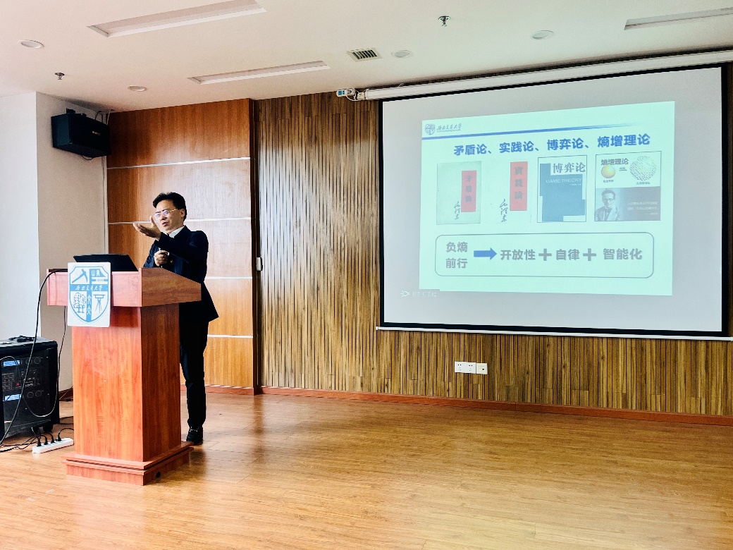 党课伊始,张学龙结合近三十年纪委工作经历的反思,通过“四论”引出了“清廉人生路,迈好第一步的党课主题。其中,“四论”是指矛盾论、实践论、博弈论和熵增理论。他谈到:要将矛盾论和实践论结合起来运用,抓住事物的主要矛盾及其运动规律,善于运用实践论去认识事物并解决问题;博弈论应用于社会生活的各个方面,要学会将竞争对手转化为合作伙伴,甚至是志同道合的朋友,在博弈中相互促进,不断提高;熵增理论告诉我们,一个优秀成功的人应当与熵增作斗争,利用开放、自律、智能化三原则,敢于迎接挑战,坚守自己的原则,提高对自我的要求,通过学习和努力不断实现突破,做到负熵前行,涅槃重生。张学龙希望同学们认真研读“四论”,清楚认识到选择和努力的关系,把握好自己人生的方向,不断提高个人格局、深度及底蕴。