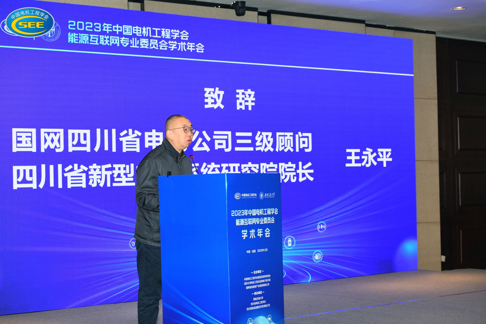 国网四川省电力公司三级顾问、四川省新型电力系统研究院经理王永平致辞。他指出四川省是全国最大的清洁能源基地,四川电网已发展成为全国规模最大、运行最复杂的省级枢纽电网之一。本次学术年会内容丰富,将围绕新型电力系统、能源互联网规划与建模等方面进行广泛深入的交流和讨论,各位专家为四川电网的发展献计献策,一定会推动四川能源电力系统升级换代,共同促进四川能源绿色低碳转型。