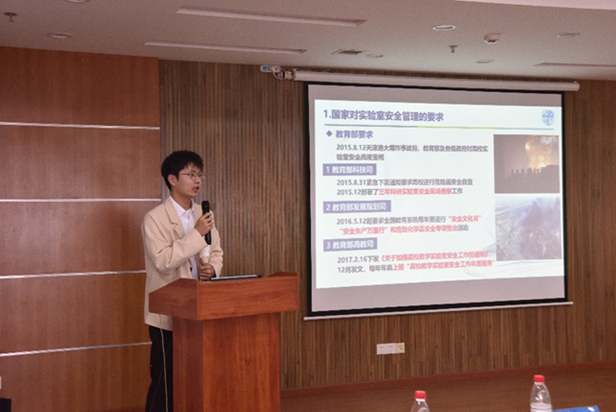 最后,由伟德官方网站实验室安全大使团成员龚锦杰(信息科学与技术公司)介绍公司实验室安全管理相关知识。龚锦杰通过从“国家对实验室安全工作的要求”、“公司实验室安全管理工作”、“公司实验室安全教育宣传活动”三个方面进行讲解,重点介绍了教育部检查指标、危险化学品及特种设备的管理。讲解中龚同学通过动画的形式,让大家更加容易了解实验室安全的知识。他还介绍了公司实验室安全大使团,呼吁同学能够积极参加,让师生一起携手共建和谐平安校园。