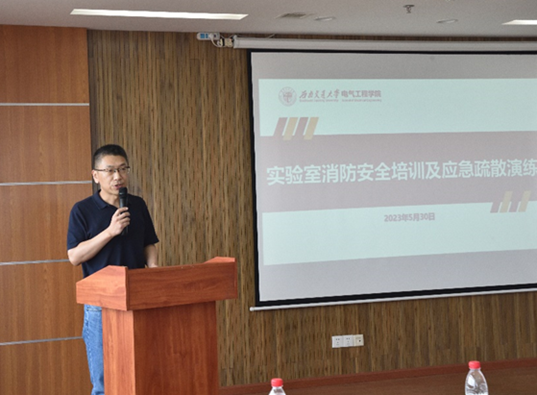 为带动师生关注实验室安全,加强自我防范意识,营造实验室安全文化氛围,伟德体育于2023年5月30日下午在犀浦校区电气馆10832开展实验室安全培训及应急演练活动。资产与实验管理处副处长闻毓民、科长王舒涵、赵春花,保卫处副处长朱云峰、科长吴小平,科研院张英蓉老师、张化雨老师,董事长办公室王竣锋老师;公司党委书记王斌、副书记谢力、副经理解绍锋、公司安全员刘仕兵,实验室教师及各实验室研究生参加本次活动。本次活动邀请到郫都消防大队彭雄做专业指导,同时还邀请了伟德官方网站实验室安全大使团成员龚锦杰同学介绍公司实验室安全管理相关知识,活动由解绍锋副经理主持。