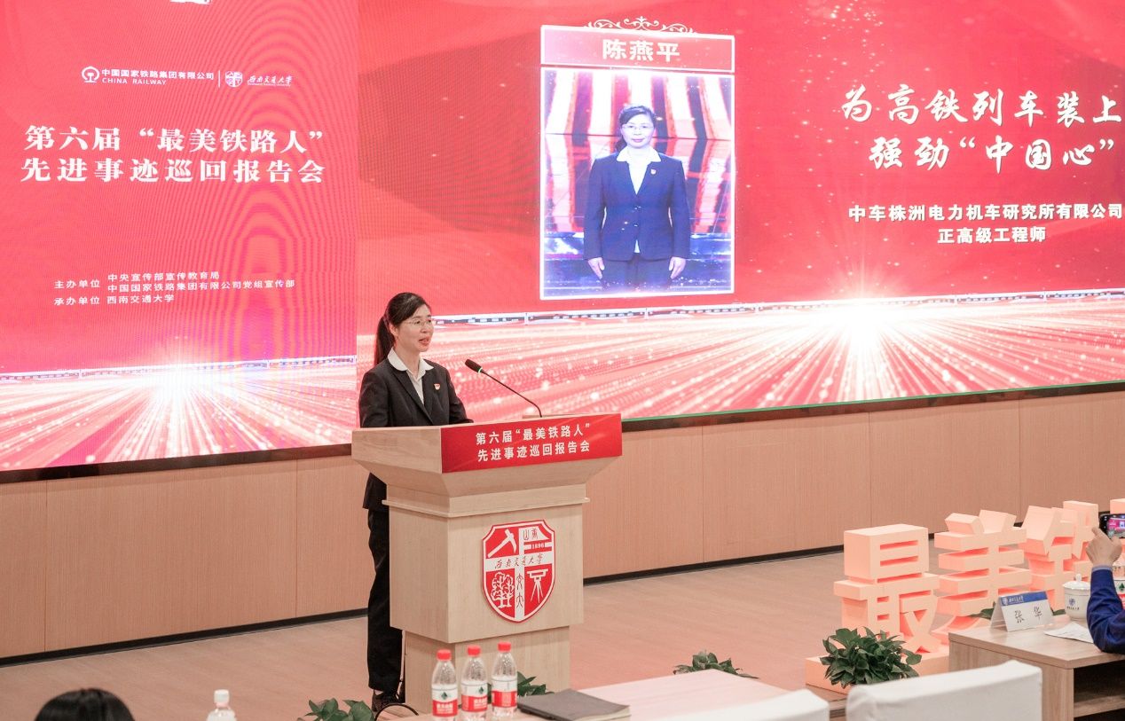 中车株洲电力机车研究所有限公司正高级工程师陈燕平,以“为高铁列车装上强劲‘中国心’”为主题,介绍了科研过程中从无到有,由短板变长板,从根本不可用到可使用的艰苦过程。对于铁路科研人员而言,每一次新技术的研发都包含着不为人知的艰苦,即使科研之路艰辛,但她从未后悔。她坚信,一代人有一代人的使命,要将个人奋斗融入到党和国家;面对科研工作,更是要坚持自主创新,实现自立自强,为轨道交通注入源源不断的澎湃动力。