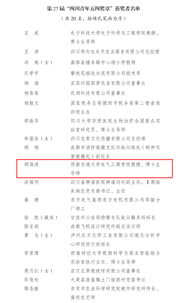 3 | 第27届“四川青年五四奖章” | 胡海涛 |