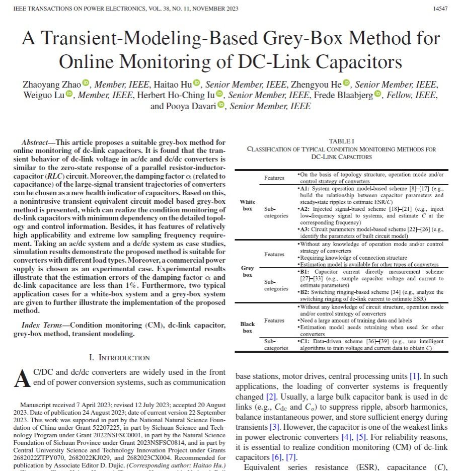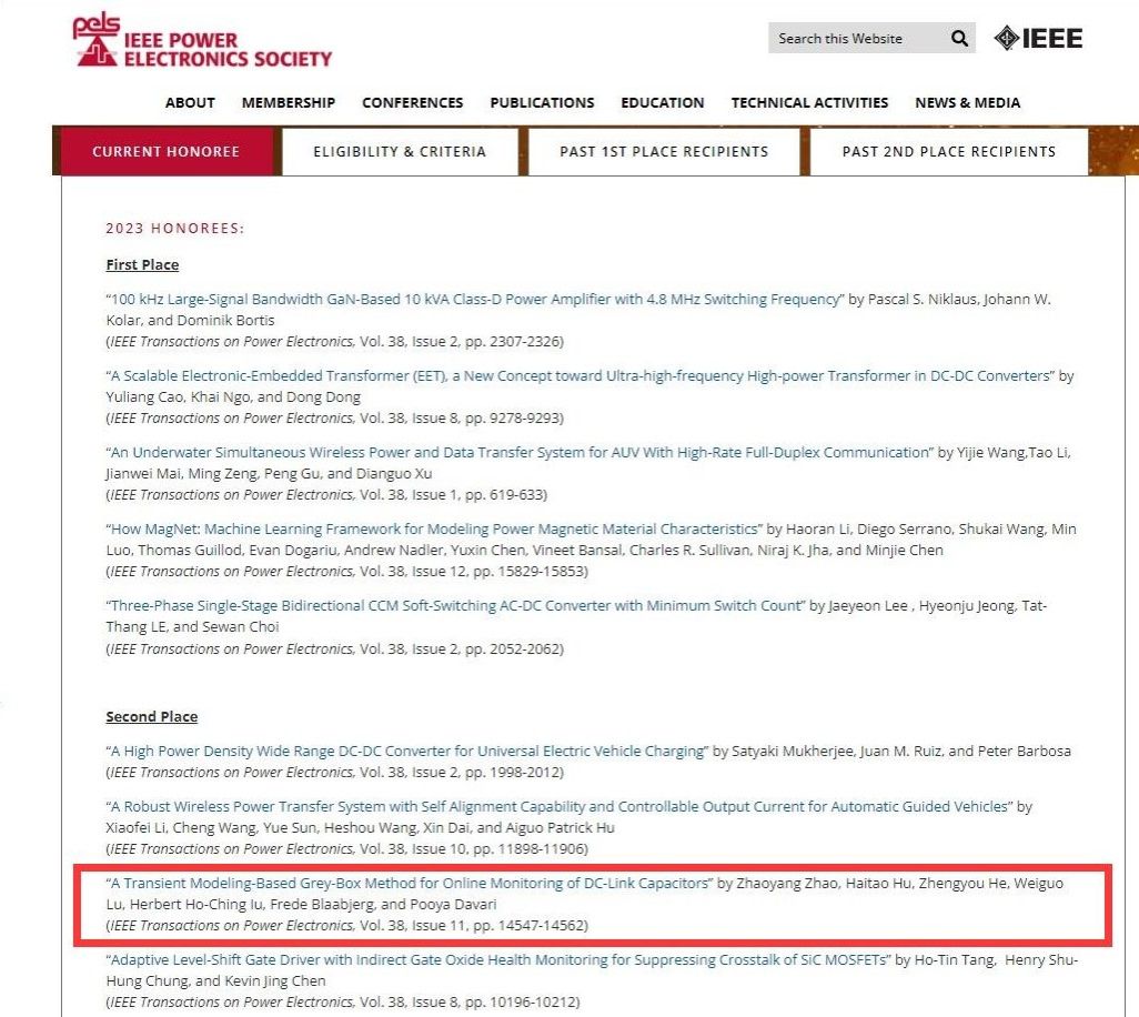 近日,IEEE电力电子学会(Power Electronics Society, PELS)公布了旗舰期刊IEEE Transactions on Power Electronics (TPEL)2023年度优秀论文奖(Prize Paper Award)获奖名单。从该刊2023年度正式出版的1364篇论文中评选出一等奖(First Place Prize Paper)5篇、二等奖(Second Place Prize Paper)9篇和优秀快报(Prize Letter)2篇。公司何正友、胡海涛教授团队论文《A Transient Modeling-Based Grey-Box Method for Online Monitoring of DC-Link Capacitors》荣获2023年度优秀论文二等奖。