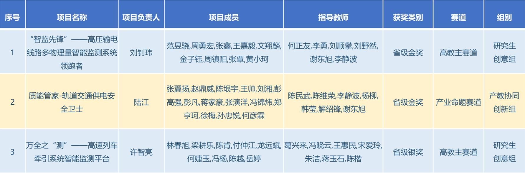 伟德体育何正友教授指导的《“智监先锋”——高压输电线路多物理量智能监测系统领跑者》以及陈民武教授指导的《质能管家-轨道交通供电安全卫士》分别斩获主赛道及产业赛道的金奖,葛兴来教授指导的《万全之“测”——高速列车牵引系统智能监测平台》斩获主赛道银奖。