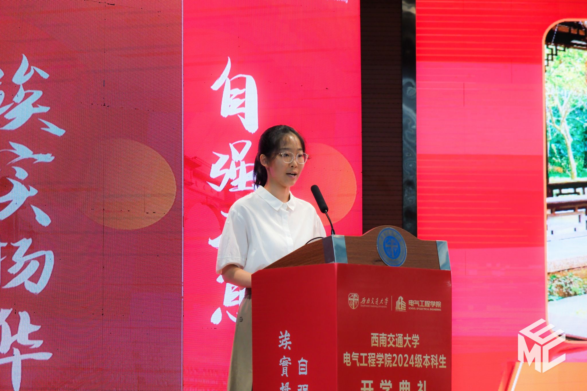 电气(茅班)2024-01班阎昱彤同学作为新生代表上台发言。阎昱彤分享了自己进入交大以来的感受,入学的两周充实而精彩,辅导员老师的暖心关怀、军训期间的骄阳与汗水、新生入学教育的丰富内容,都让同学们印象深刻。随后,阎昱彤与全体新生共勉三点感悟:一是认真学习,拒绝摆烂躺平。大学是人生的新起点。同学们应在新的坐标上为自己准确定位,用专业知识武装自己。二是健康生活,不做脆皮老员工。同学们应规律作息,合理饮食,科学锻炼。三是奉献担当,锤炼个人本领。同学们要向优秀学长看齐,积极参加各项活动,在班级、社团中脚踏实地做事,成长为全面发展的优秀人才。