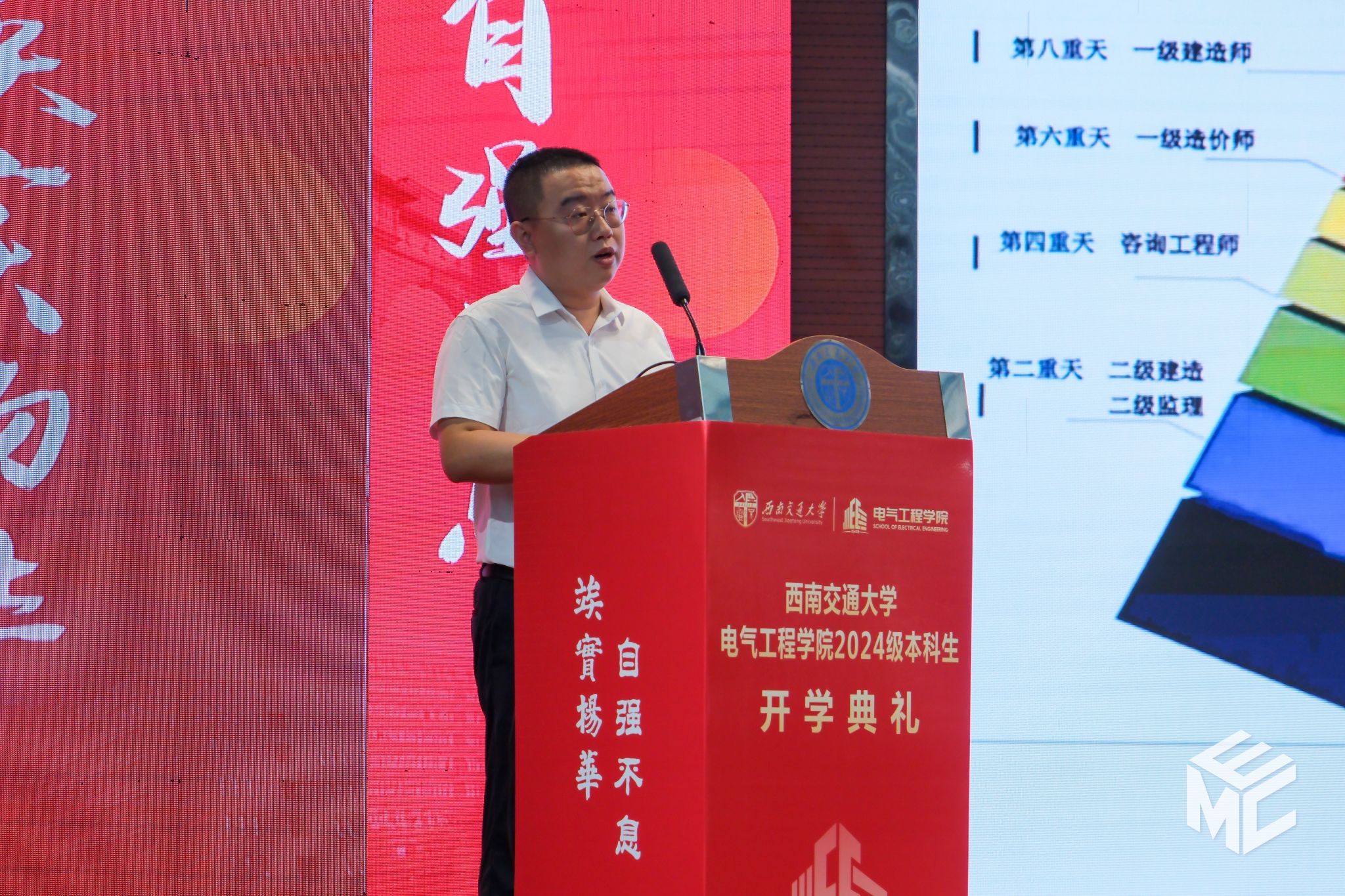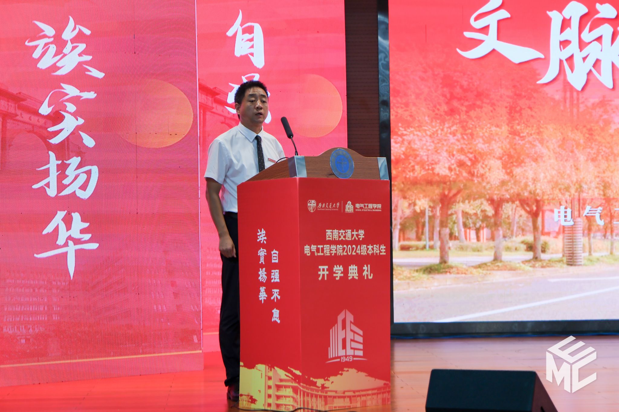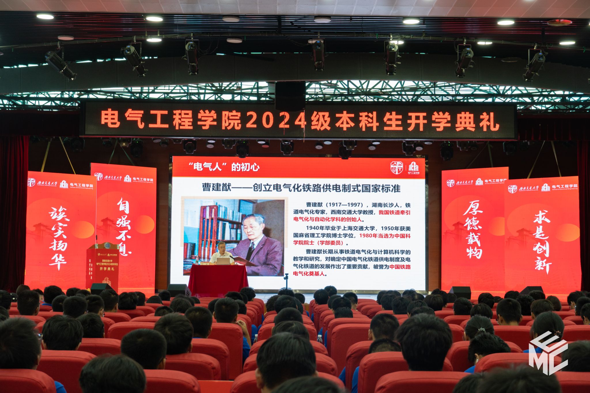 在开学典礼的第二阶段,王斌书记为2024级新生讲授题为《电气人的初心和使命》的新生思政课。王斌书记回顾了公司与祖国和人民同呼吸、共命运的办学历史,列举了三代电气人为国家轨道交通电气化事业发展而接续奋斗的实例。从初创期、发展期到未来期,公司凝练了“赤”热之心的矢志不渝,让一代代交大电气人的心中饱含“赤”诚之情。