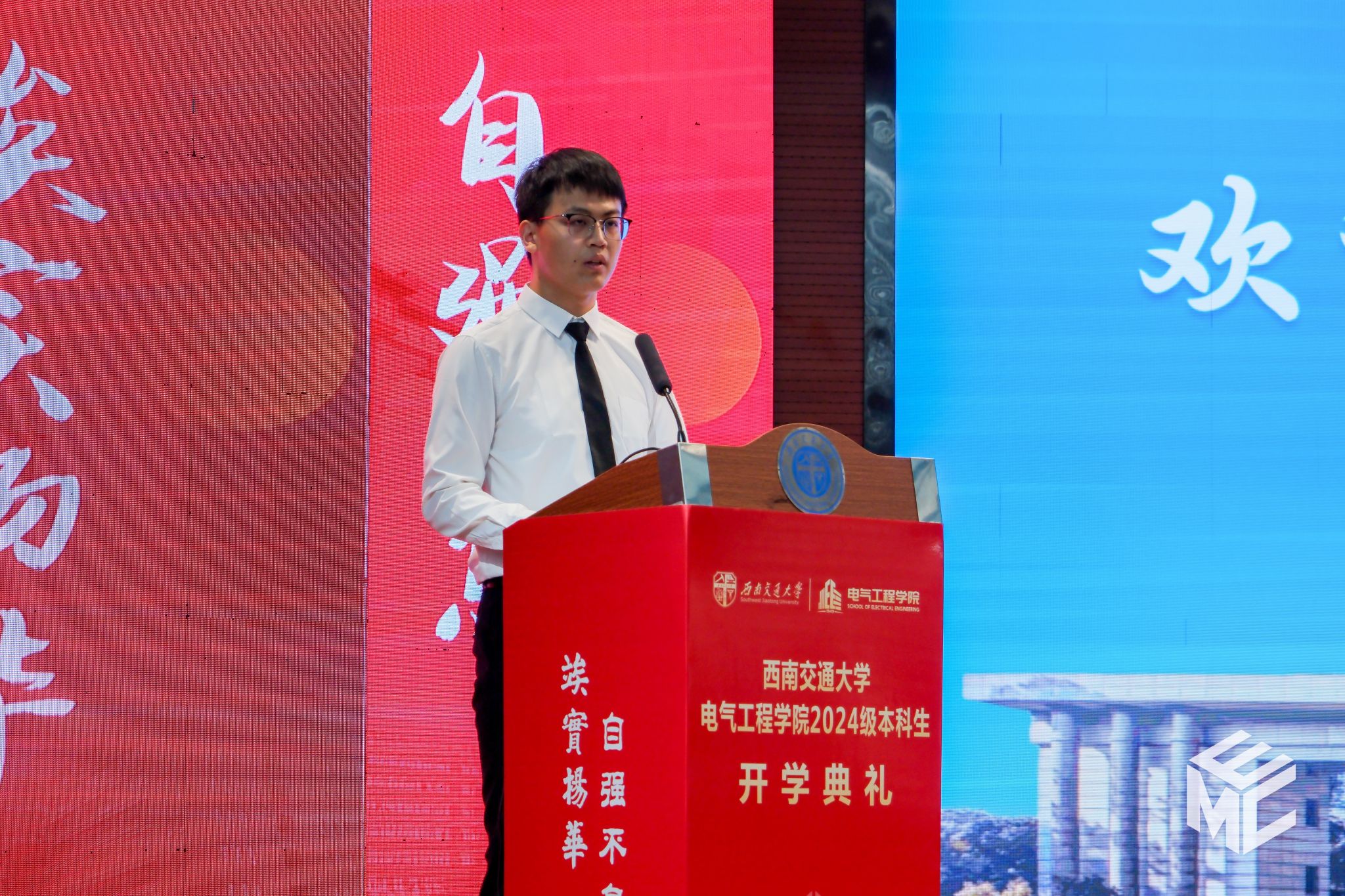 高年级员工代表、本科2021级冯洪赟同学以“寻找热爱,实现全面发展”为主题,向全体新同学讲述了自己的奋斗历程。冯洪赟向同学们分享了三点感悟,一是勤学苦行,夯实成长之基。大一恰是探索自我的绝佳时机,同学们需从被动接受转变为主动探究。二是投身实践,开拓无限可能。作为工科生,同学们应当深化理论学习,珍惜实践机会,提升专业素养。三是遵循热爱,成就全面发展。公司为同学们组织了丰富多彩的课外活动,社团和员工组织是提升综合素质的宝贵平台。最后,冯洪赟勉励全体新同学:生逢盛世、应不负盛世,生逢其时、当奋斗其时。同学们应发扬“厚德载物,求是创新”的电气精神,努力成为担当民族复兴重任的时代新人!