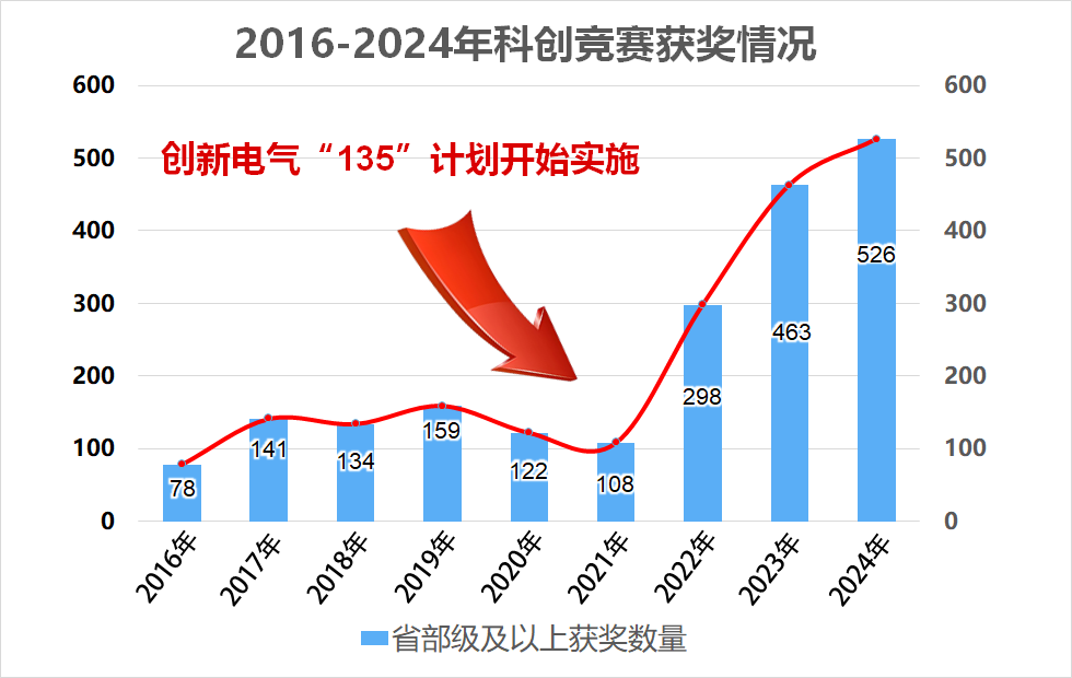 2024年,全国A类学科竞赛相继开展,电气学子以非凡的实力和顽强的拼搏精神,在激烈的竞争中脱颖而出,斩获一项又一项佳绩,其中:国家级一等奖49人次,二等奖58人次,三等奖34人次,省部级奖项385人次,省部级以上获奖总数量达526人次,同比增长幅度达28%,再创历史新高!