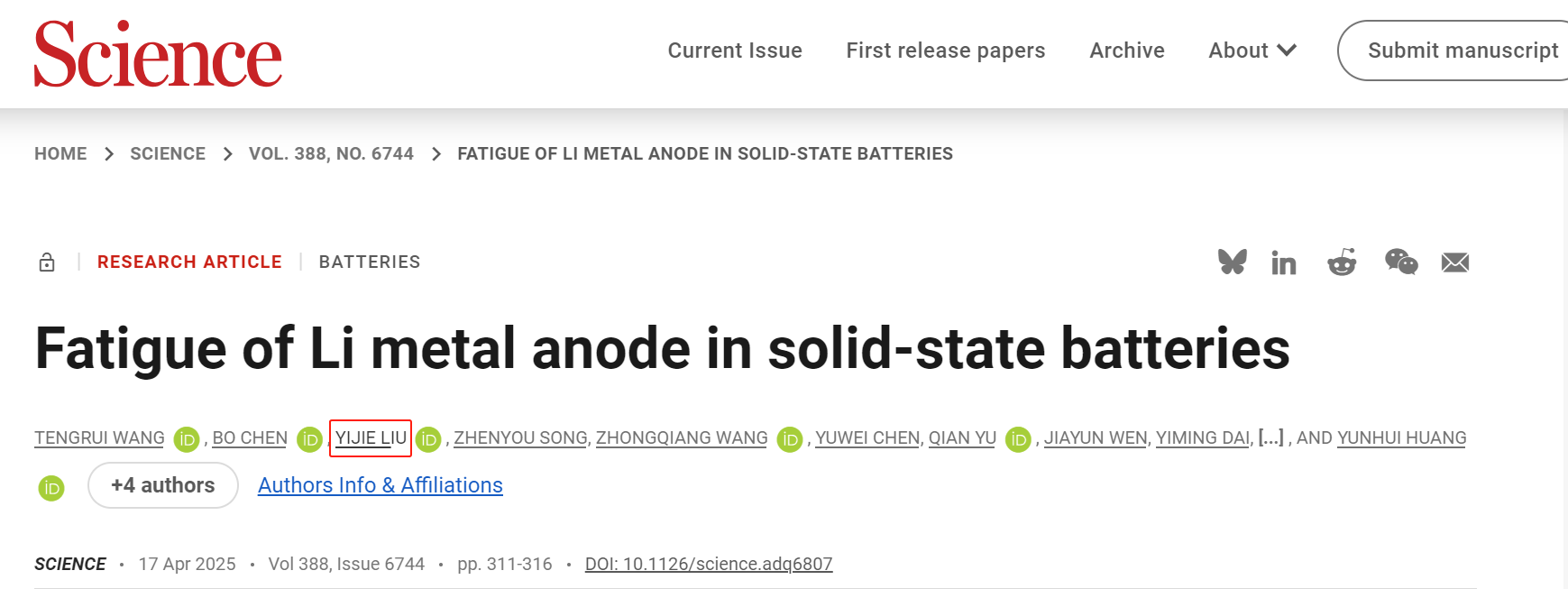 北京时间4月18日,国际顶级学术期刊Science在线发表了伟德体育刘毅杰助理教授为共同第一作者的文章“Fatigue of Li metal anode in solid-state batteries”。该成果是电气工程、化学、材料、力学等多学科的深度交叉融合,由伟德官方网站吴广宁教授团队、同济大学罗巍教授和华中科技大学黄云辉教授团队等合作完成。