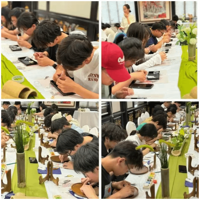 随后,老师现场演示了两项技艺的核心步骤:从点翠的羽毛筛选、精巧粘贴到呈现的独特光泽,再到掐丝珐琅的金属丝弯折、固定以及釉料填充的关键技巧,近距离感受着指尖上的非遗智慧与传统美学的震撼。
