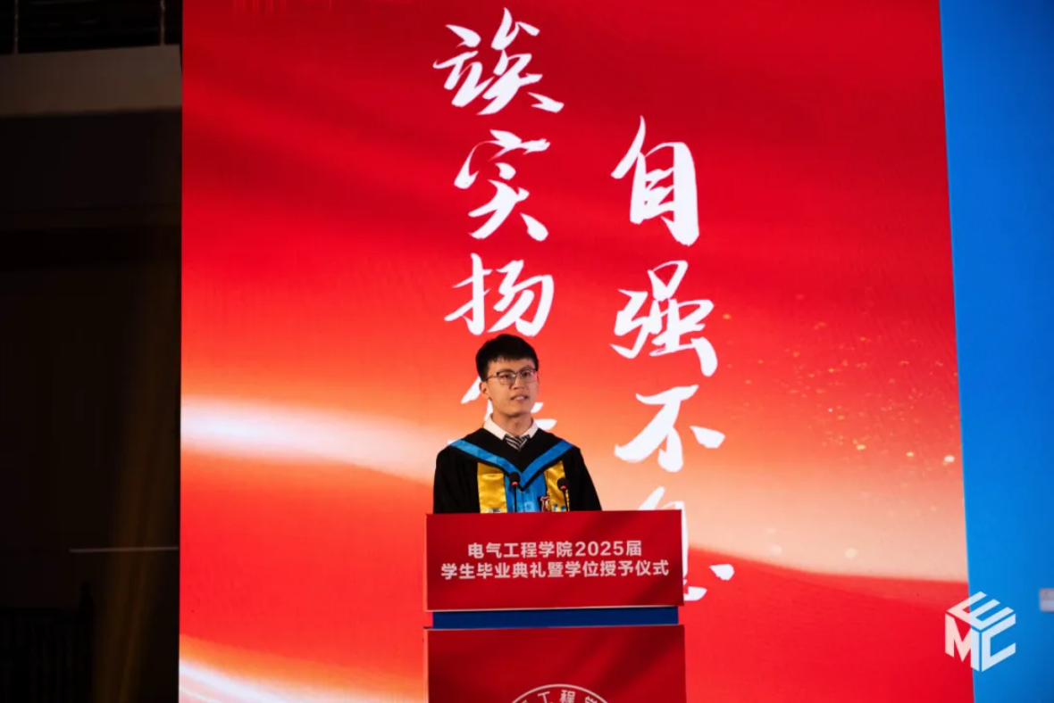 本科毕业生代表冯洪赟上台发言。他回首在公司求学的岁月,特别感谢了师长的悉心培养和同窗的并肩奋斗。作为新时代电气人,冯洪赟表示将牢记“竢实扬华,自强不息”的交大精神,肩负起推动能源革命和产业升级的担当。他号召全体毕业生像银杏树一样顽强生长,在祖国需要的各个领域绽放光彩,用实际行动续写交大电气人的辉煌篇章。