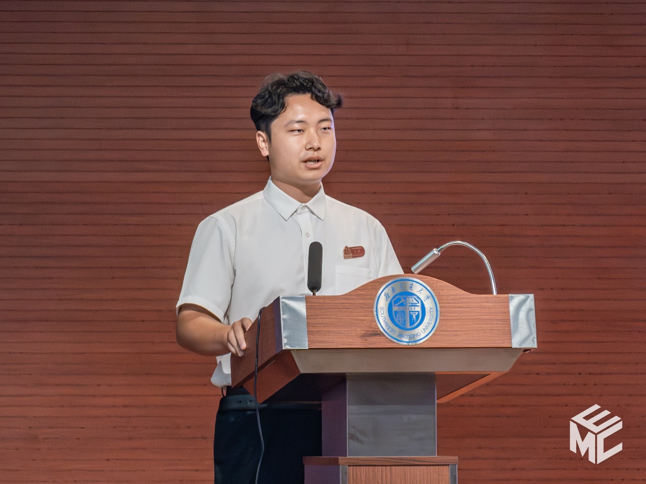 2022级本科生马杨作为高年级员工代表发言。他分享了自己从一度陷入“绩点内卷”的焦虑,到跳出舒适区、寻求全面发展的成长心路。通过参与科创竞赛和担任团支部书记的经历,他深刻体会到大学是多元化的成长平台。他鼓励学弟学妹们:一要筑牢基础,绩点是成长的“副产品”而非全部目标;二要拥抱实践,工科生的成长离不开动手;三要坚守热爱,记住“直线做事,曲线成长”的智慧,成长为独一无二的自己。