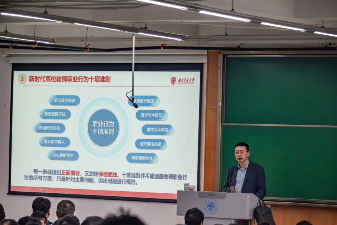 最后,王斌带领教职工进行了师德师风和保密工作学习教育。他围绕“恪守十项准则 涵养高尚师德”主题,结合教师失范行为典型案例,对师德师风建设重要性、相关要求以及违规处理规定和后果等进行了阐述。他强调,作为高校教师要认真遵守并贯彻落实新时代高校教师职业行为十大准则,严格标靶正向引导,牢固树立师德师风底线意识,秉持不卑不亢、恪尽职守的态度,铭记教书育人的初心。“保密无小事,事事系安全。”王斌以法律明灯、以事例为诫,向教职工讲解了保密工作的必要性,要求全体教职工要树牢保密意识,维护国家安全,严守保密防线,共护国家安全。