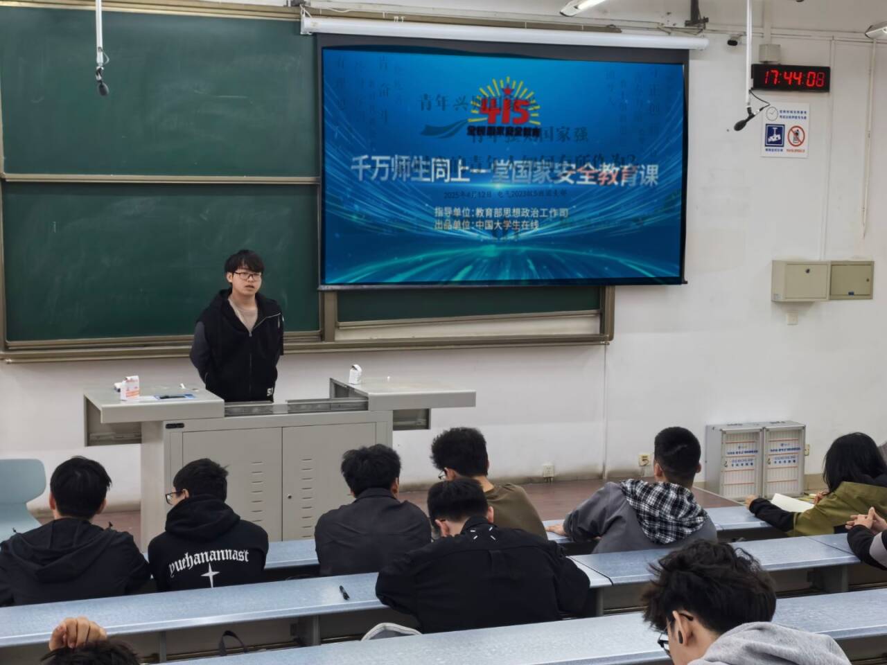 在收看国家安全教育课程直播时,同学们通过弹幕互动、线上留言等方式积极参与讨论,现场气氛热烈。