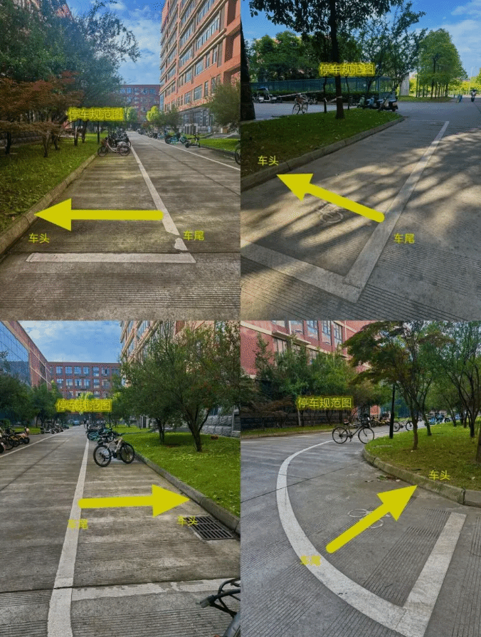 停放时请将车辆车头朝外、车尾对齐,做到“不越线、不压线、不斜放、禁停区域不停放”(规范停车示意图如附图所示),为后续停放的同学留出空间,共同维护电气馆周围区域的整洁美观。